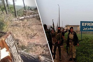 | Saturday 26th June, 2021. Furqet El-Hemzat mercenaries cut down 1,500 olive trees belonging to Behçet Ebdo, the former Defense Committee co-chair of Afrin Canton. The same sources said that the Turkish state had also turned Ebdo's house in the village into a headquarters and confiscated his house in the center of Afrin. |