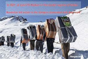 | Monday 3rd January, 2022. In 2021, at least 215 Kolbars in the border regions of Iranian Kurdistan fell victim to the dangers associated with their work. Citing the registered statistics of Hengaw Human Rights Organization, at least 52 Kolbars were killed and 163 Kolbars were injured in the border regions of Iranian Kurdistan. 140 Kolbars, the majority, were injured or killed as a result of armed attacks by Iranian border guards, and in some cases by Turkish or Iraqi border guards. 34 more Kolbars were injured or died as a result of natural hazards such as heavy snowfall and cold or fallling into the depths on the unsecured mountain trails. |
